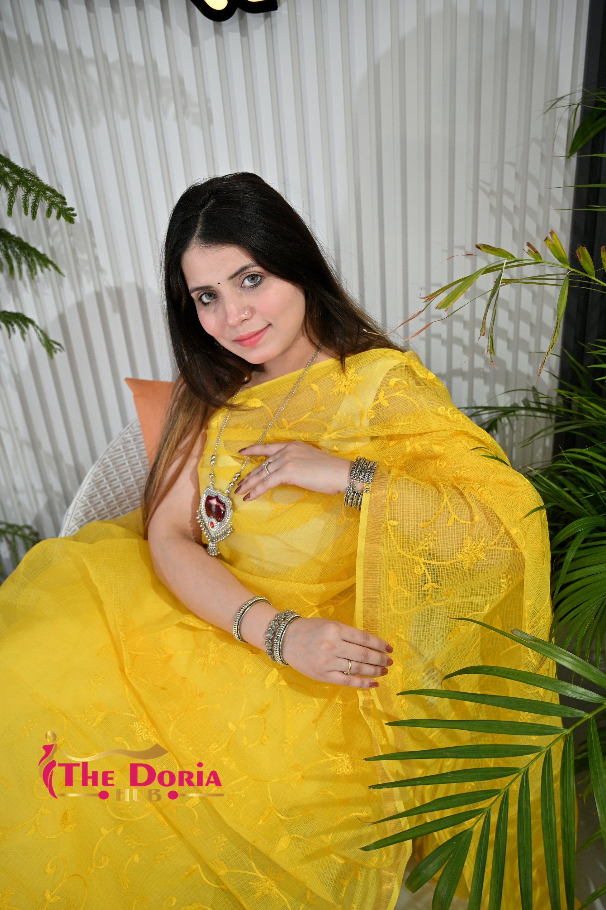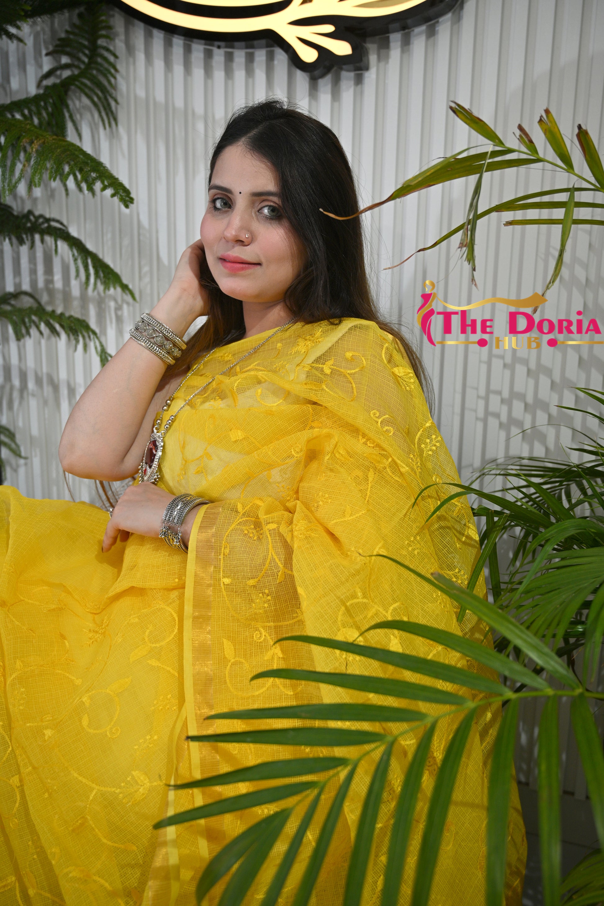 The saree is a striking solid bright yellow and features delicate self-color floral or geometric self-work/embroidery subtly woven throughout the body, adding texture and depth. The lightness and sheer quality of the Kota Doria fabric allow for a graceful, flowing drape, making it an ideal choice for festivals, daytime events, or summer wear. A simple, complementing border maintains the focus on the saree's stunning color and texture.