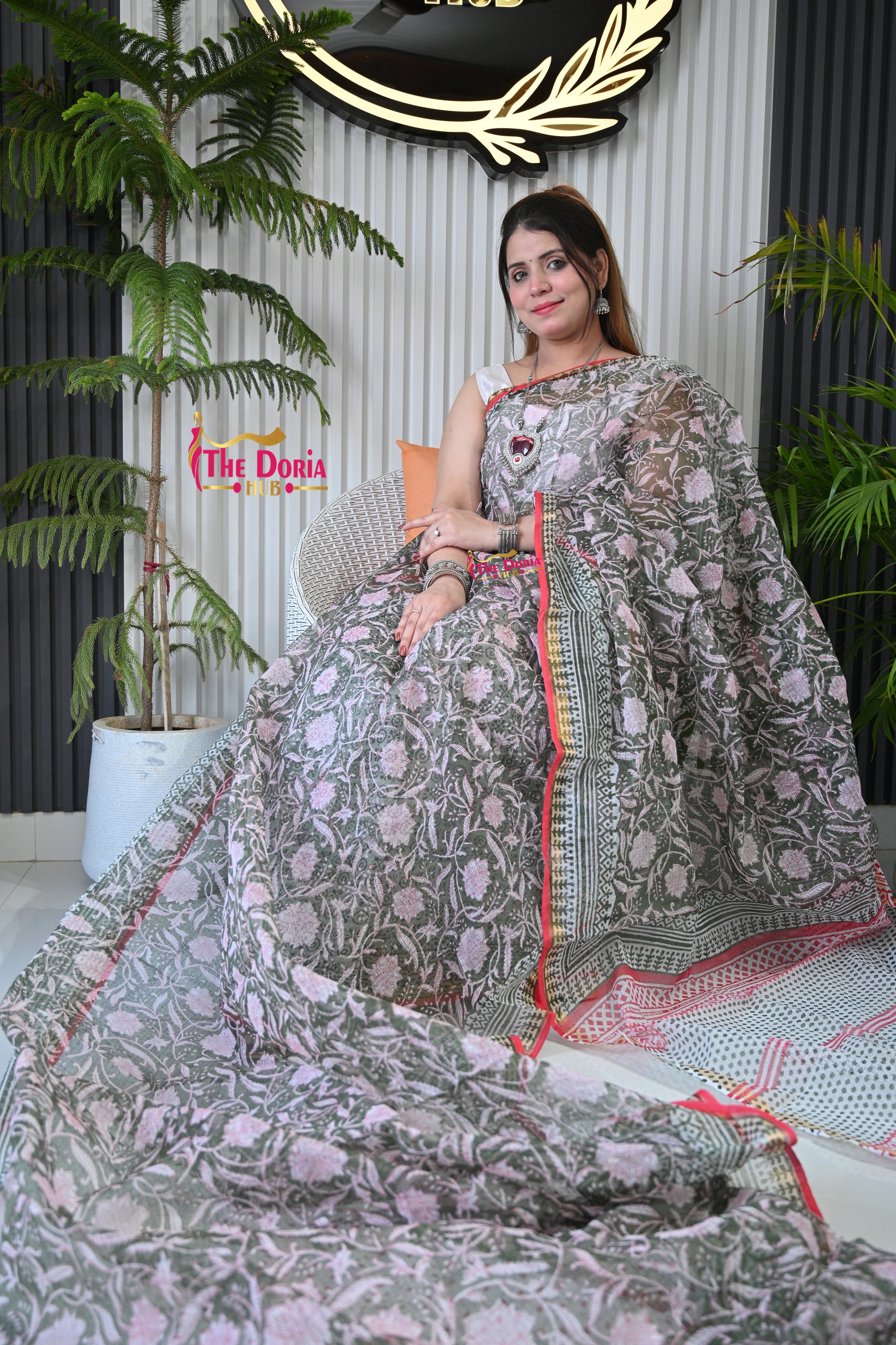 Floral Hand Block Kota Doria Saree