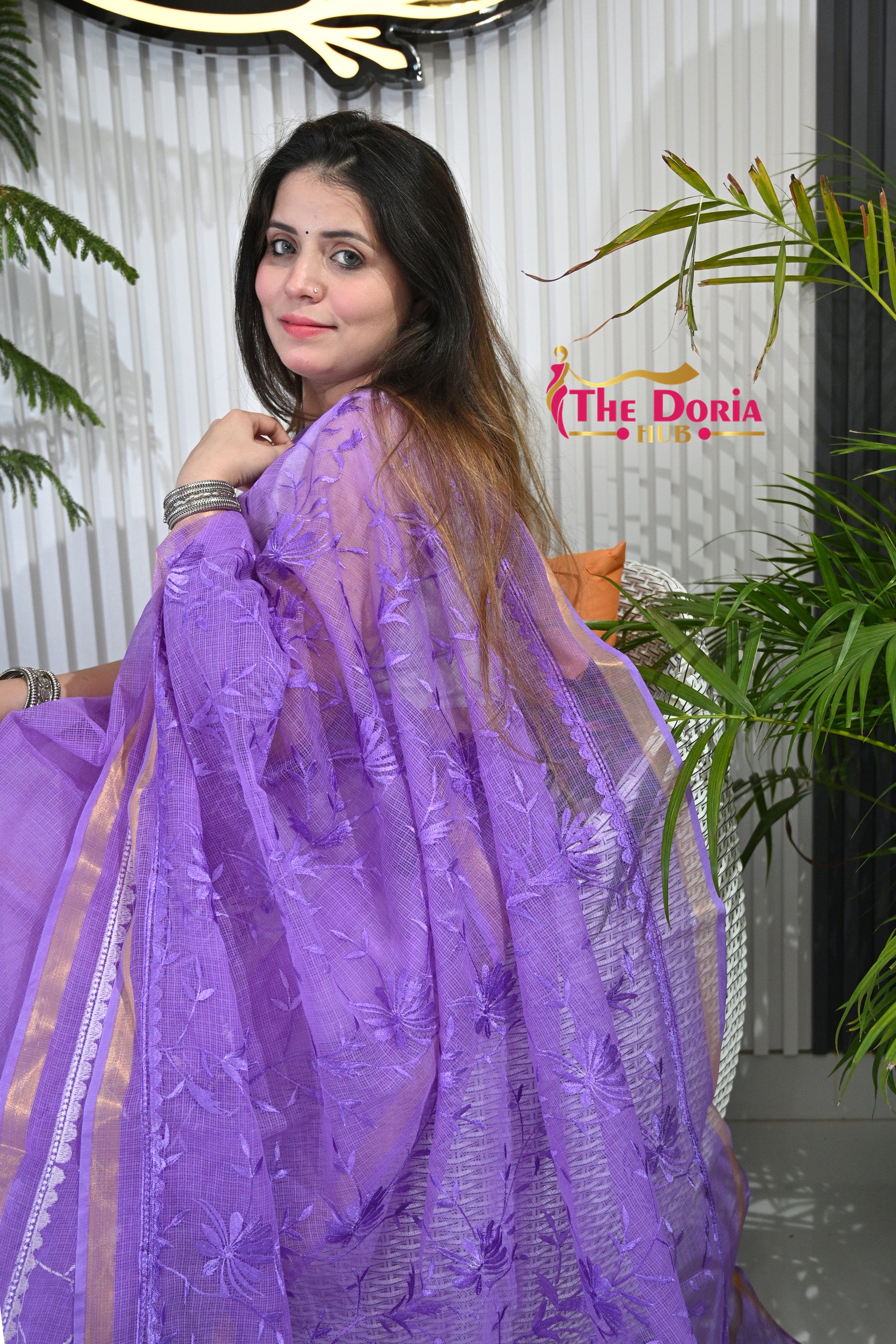The saree features a lovely lavender or light purple hue that is completely covered in intricate, tone-on-tone floral thread embroidery. This delicate work adds a rich, dimensional texture across the entire body and pallu, elevating the simplicity of the sheer cotton base. A subtle gold zari border provides a neat and elegant finish, perfect for festive or semi-formal occasions.